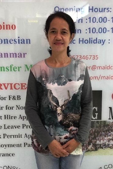 ROTAO ALMERA LEA VILLASANTA, Ex-Singapore from the Philippines. She has experience in general household work like cleaning,laundry,ironing etc., she is responsible, confident and trustworthy. She has 2 childrens (21,20). She Speaks English. She is good with babies. She is good with children.